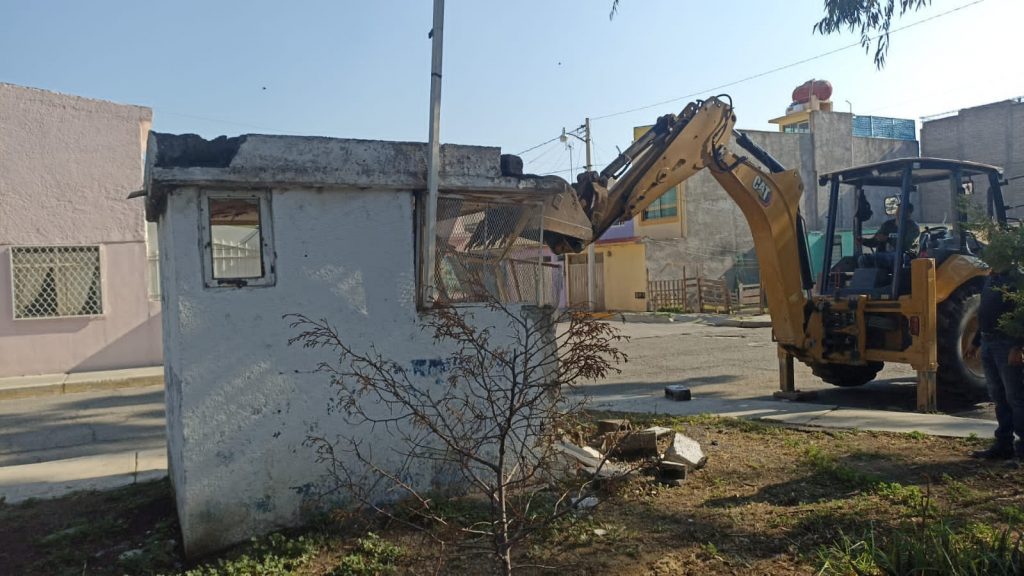 #Tizayuca, #Hgo.- A petición de los vecinos, esta mañana, personal de la Secretaría de Obras Públicas 2020-2024 de Tizayuca, demolió una antigua caseta de vigilancia ubicada entre las calles Clavel esquina con Azalea, pertenecientes al fraccionamiento Nuevo Tizayuca.