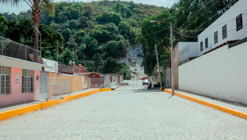 Dicha obra consistió en la rehabilitación de la superficie de rodamiento con empedrado ahogado, en el tramo que comprende entre calle Tabachín y Valle de Matatipac, a lo largo de 64.46 metros lineales.
