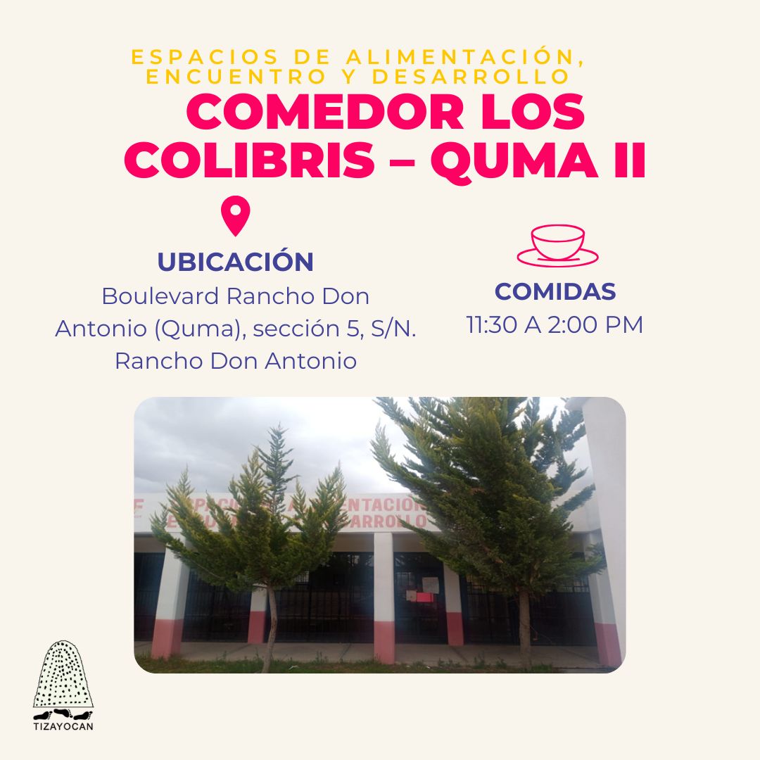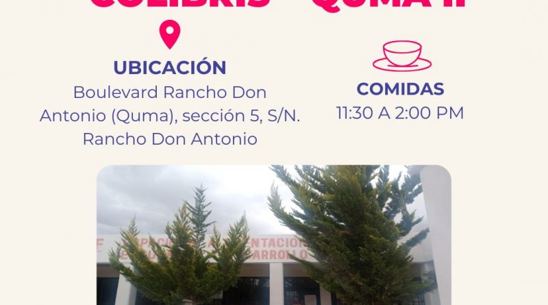 #Tizayuca, #Hgo.- Garantizar la alimentación a población vulnerable es uno de los objetivos principales para Tizayuca, es por lo que en el SMDIF invitan a los ciudadanos a asistir al Espacio de Alimentación «Los Colibríes – Quma II,» el cual está al servicio de lunes a viernes con comidas de 11:30 am a 2:00 pm.