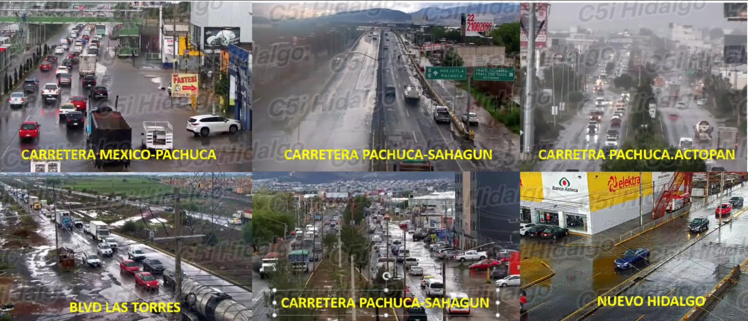 Tránsito lento debido a los anegamientos originados por la lluvia sobre la carretera México-Pachuca y bulevar Las Torres, a la altura del crucero.