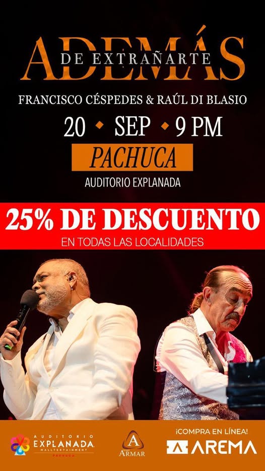 #Pachuca, #EstadoDeHidalgo.- Este septiembre, el Auditorio Explanada Pachuca será testigo de una noche inolvidable. Francisco Céspedes, con su voz profunda y nostálgica, se unirá al piano magistral de Raúl Di Blasio en una velada llena de emoción, romanticismo y talento. Una cita con la música que ha tocado el alma de generaciones.